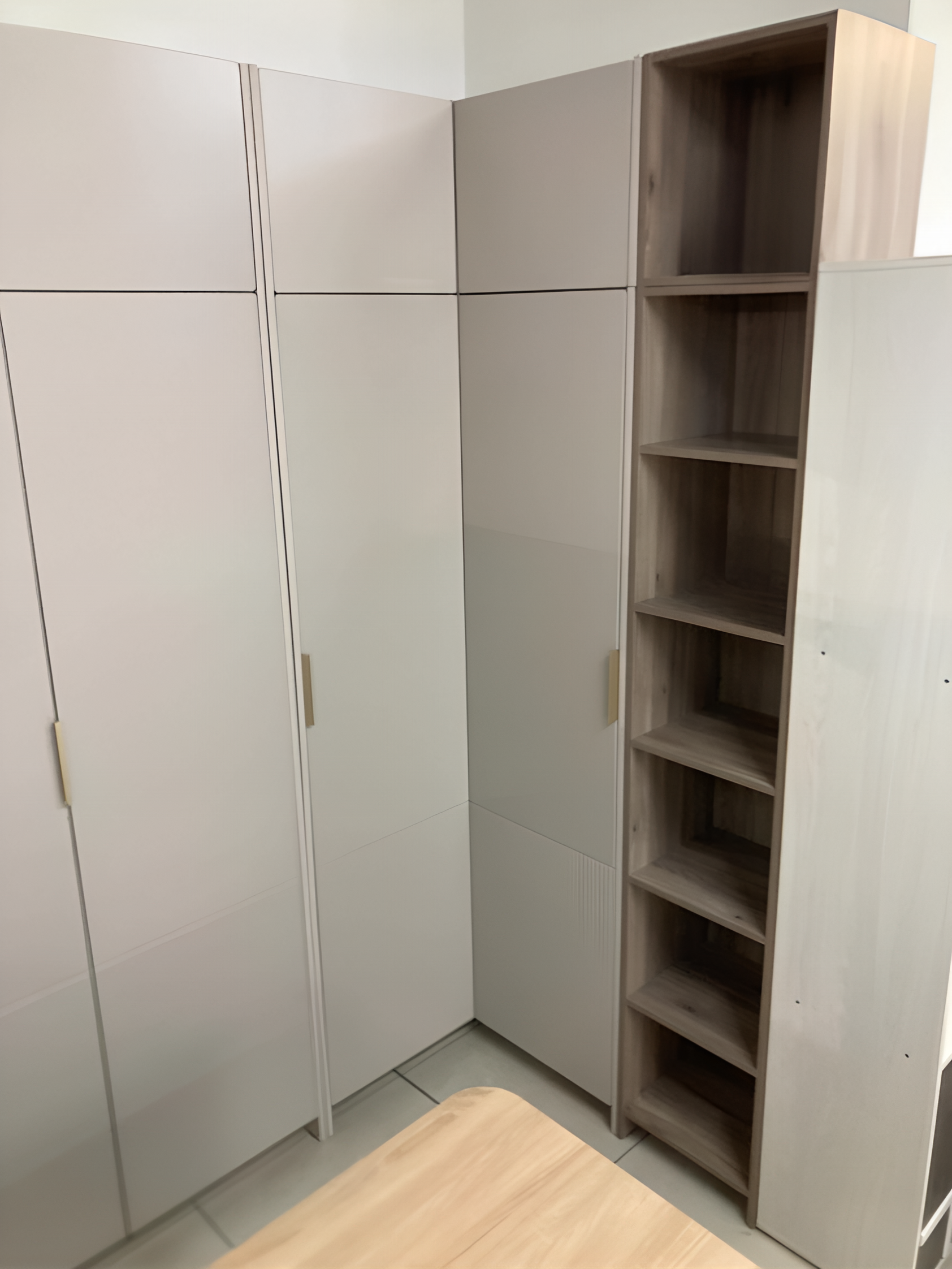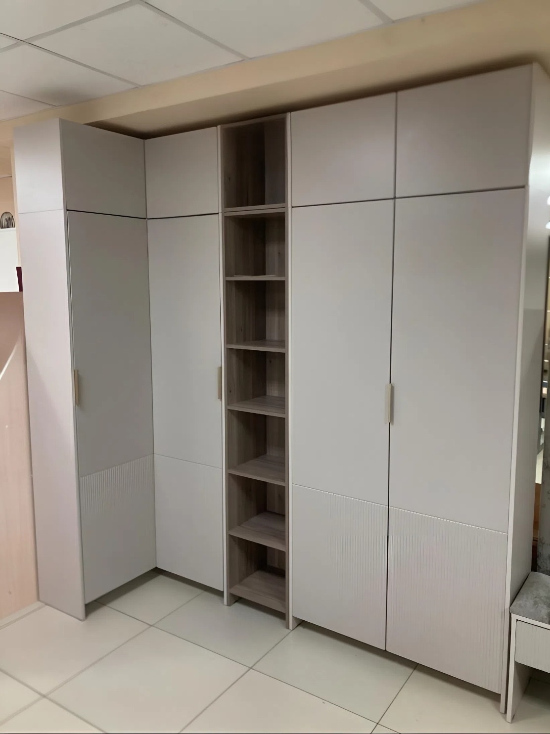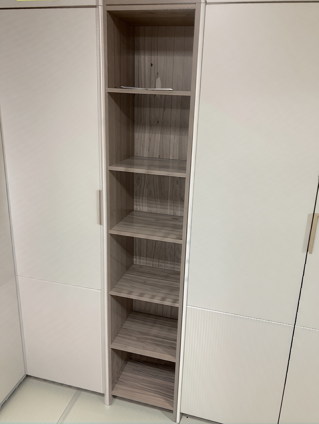 Стеллаж из коллекции "Пандора" помогает разбавить "глухие" фасады шкафов и добавить в комнату воздуха. Узкая конструкция (384 мм) позволяет вписать его в любую нишу или использовать как завершающий элемент стенки. Это идеальное место для вашей библиотеки.
