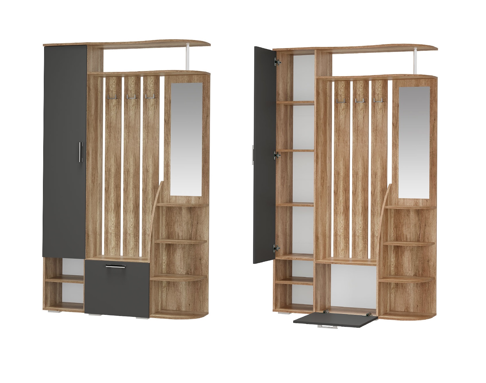 Гарнитур мебели для прихожей «Агата» — это практичное современное решение для вашего дома. Модель выполнена в стильных цветах «дуб каньон» и «графит», которые хорошо дополнят как яркое помещение, так и интерьер с преобладанием натуральных оттенков.