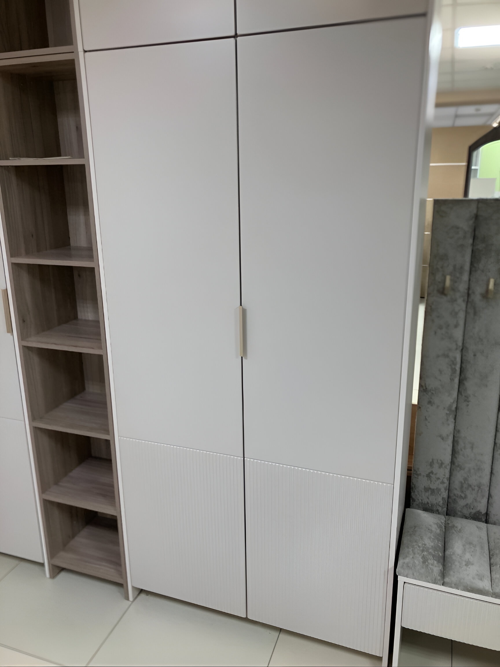 Шкаф "Пандора" очаровывает с первого взгляда. Матовые фасады Soft-touch в теплом оттенке "Кашемир" и изящная фурнитура "пыльно-матовое золото" создают атмосферу уюта и статуса. Модульная система позволяет собрать идеальную прихожую или спальню.