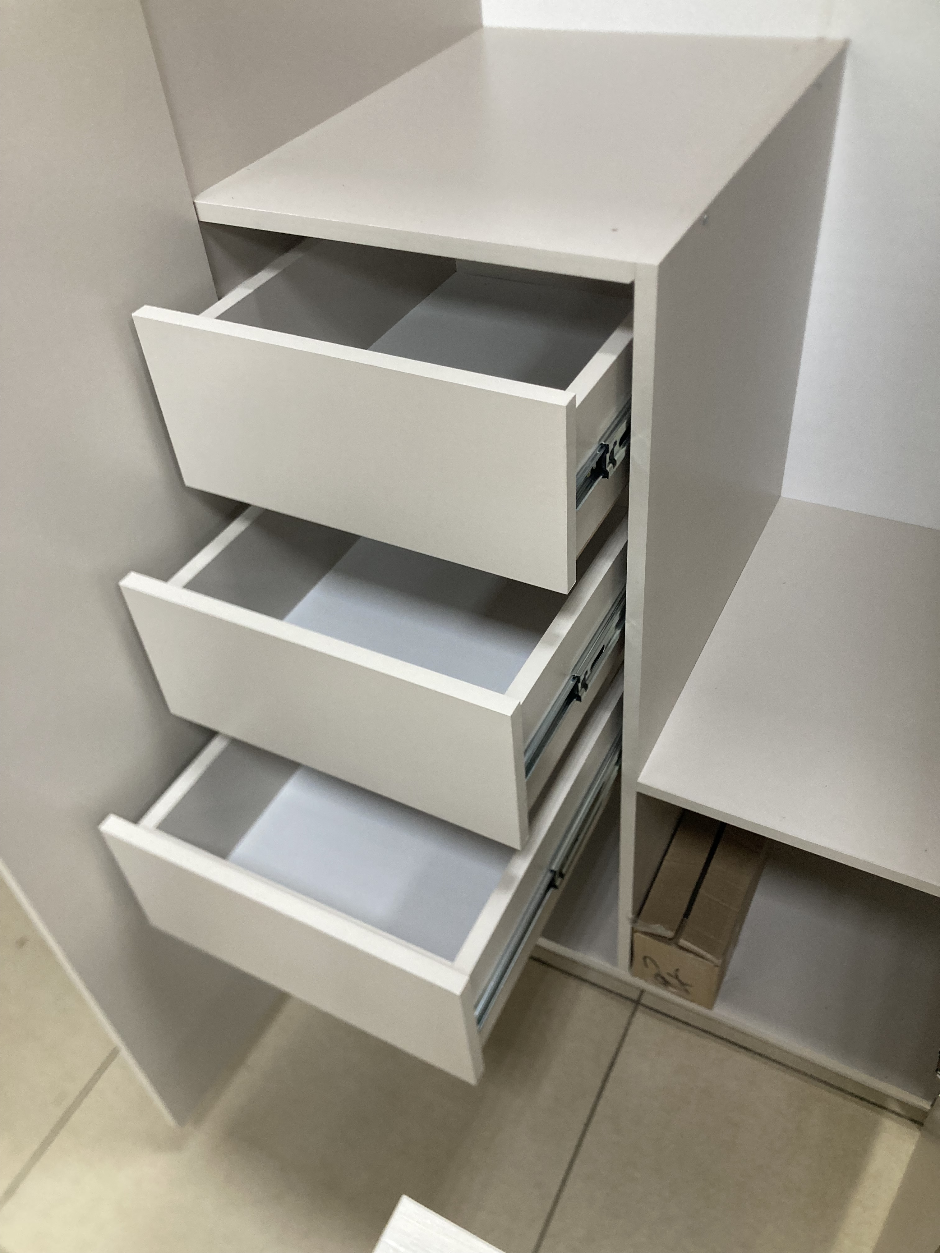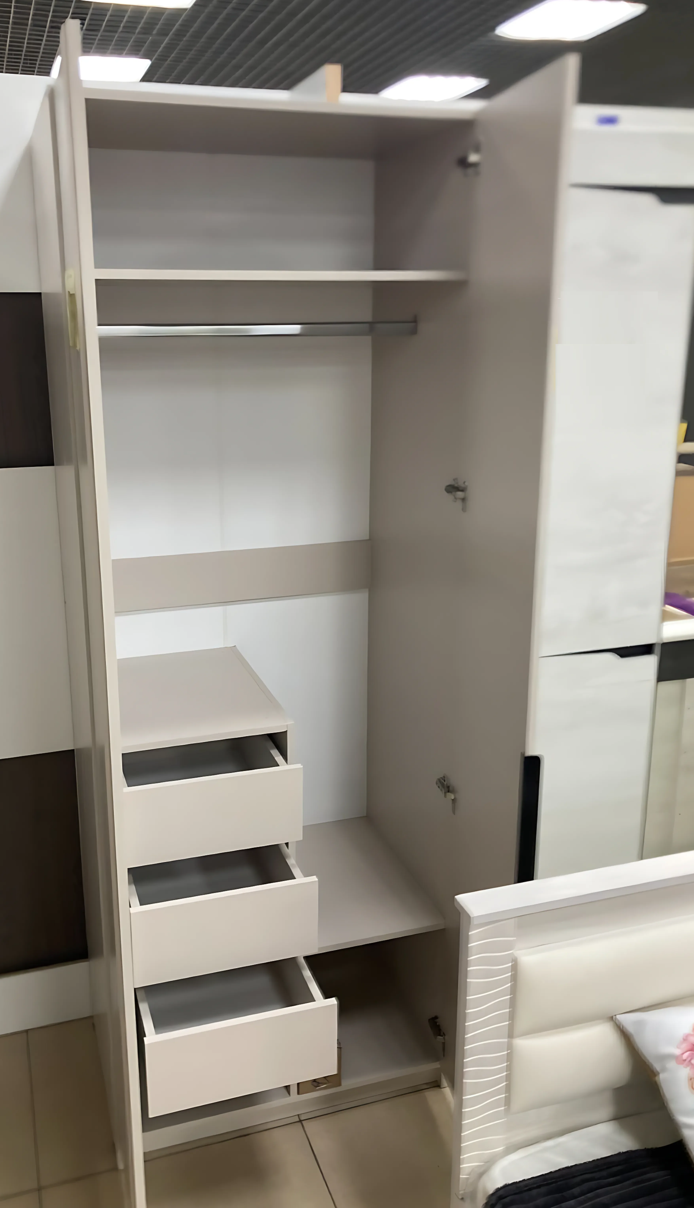 Шкаф совмещает отделение для вешалок и три выдвижных ящика на шариковых направляющих. Это самое востребованное сочетание для хранения одежды и белья. Корпус из качественного ЛДСП и МДФ фасады гарантируют долгую службу.