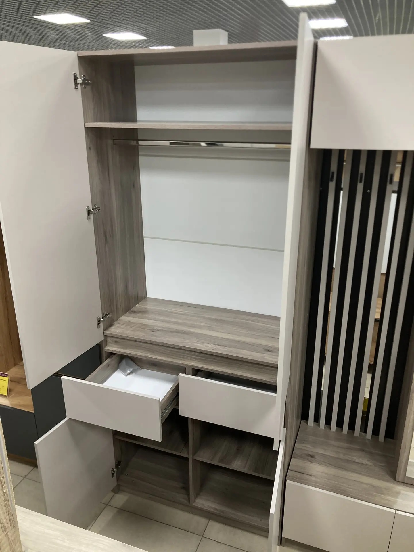 Петли створок – накладные с доводчиком/без доводчика. Максимальная нагрузка на полку – 10 кг, на штангу – 5 кг, на ящик – 5 кг.