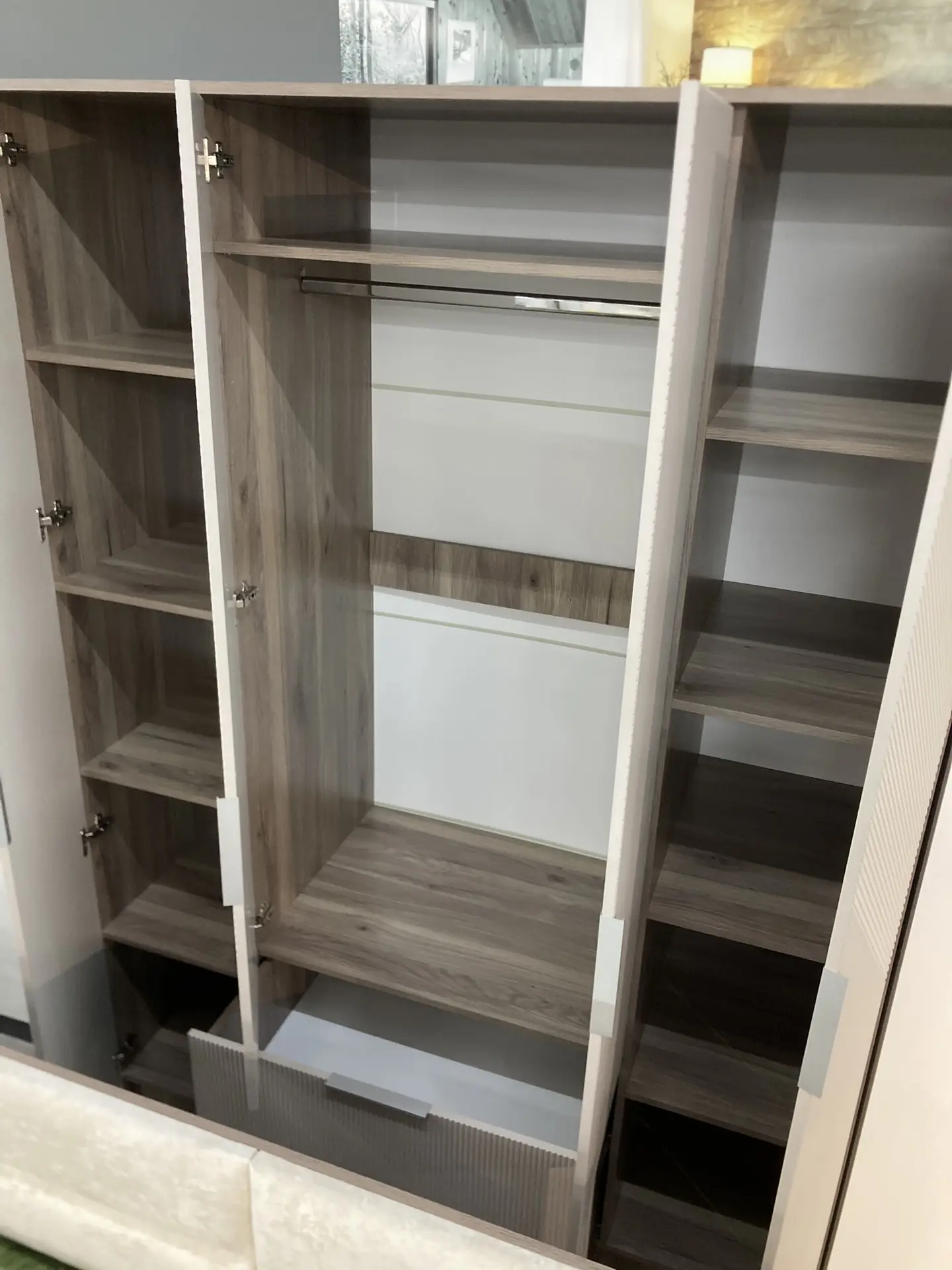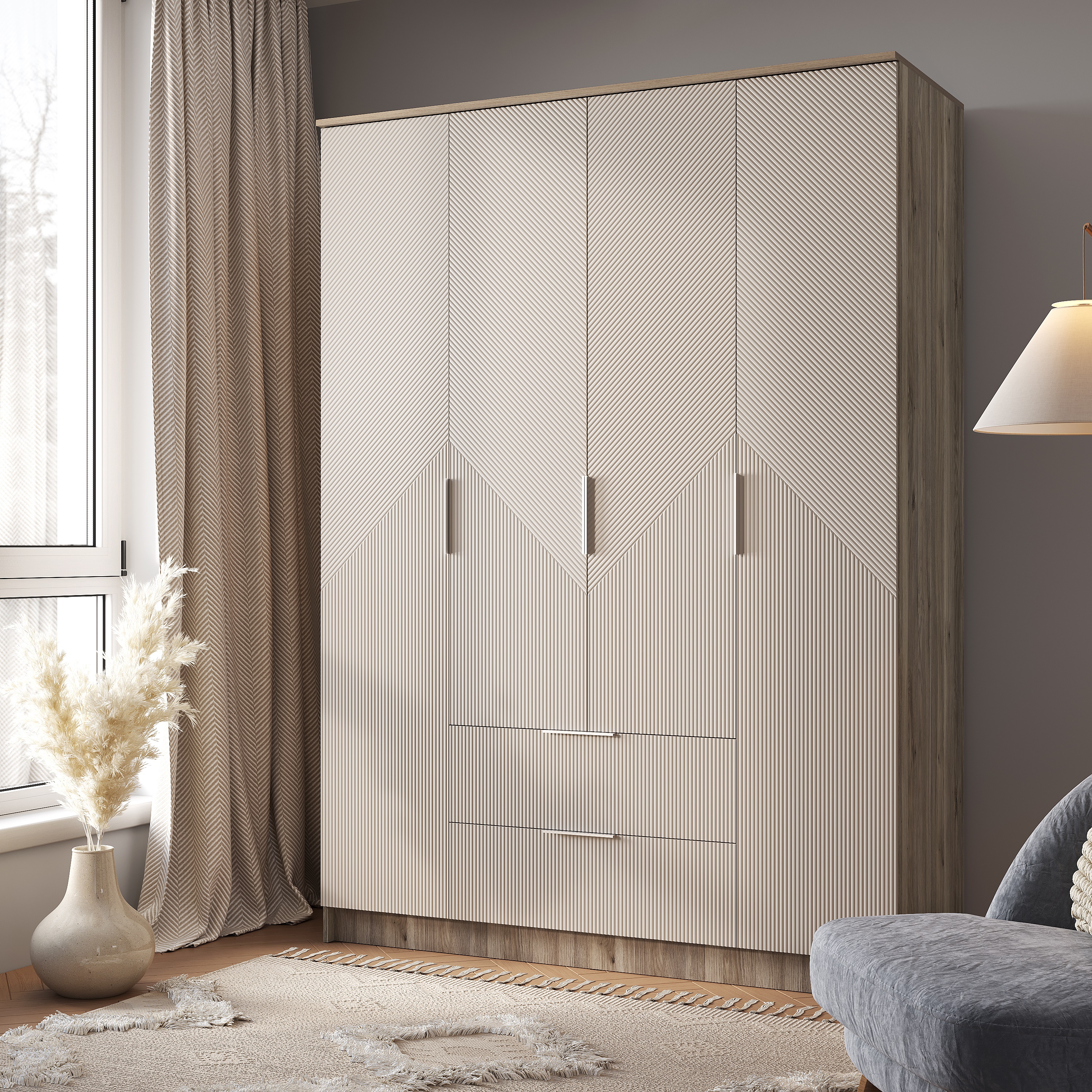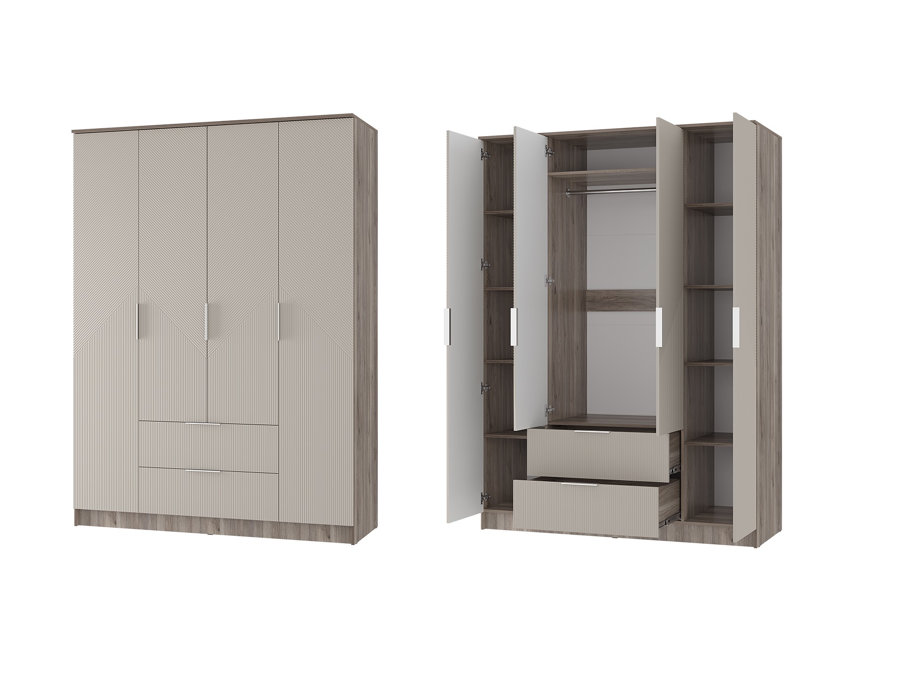 Шкаф четырёхстворчатый (ШК-11) имеет пять удобных полок по бокам для хранения одежды. Помимо этого, по центру расположены две вместительные секции для хранения ежедневной одежды. В нижней части шкафу находятся два вместительных ящика — это идеальное место для хранения обуви или постельного белья.